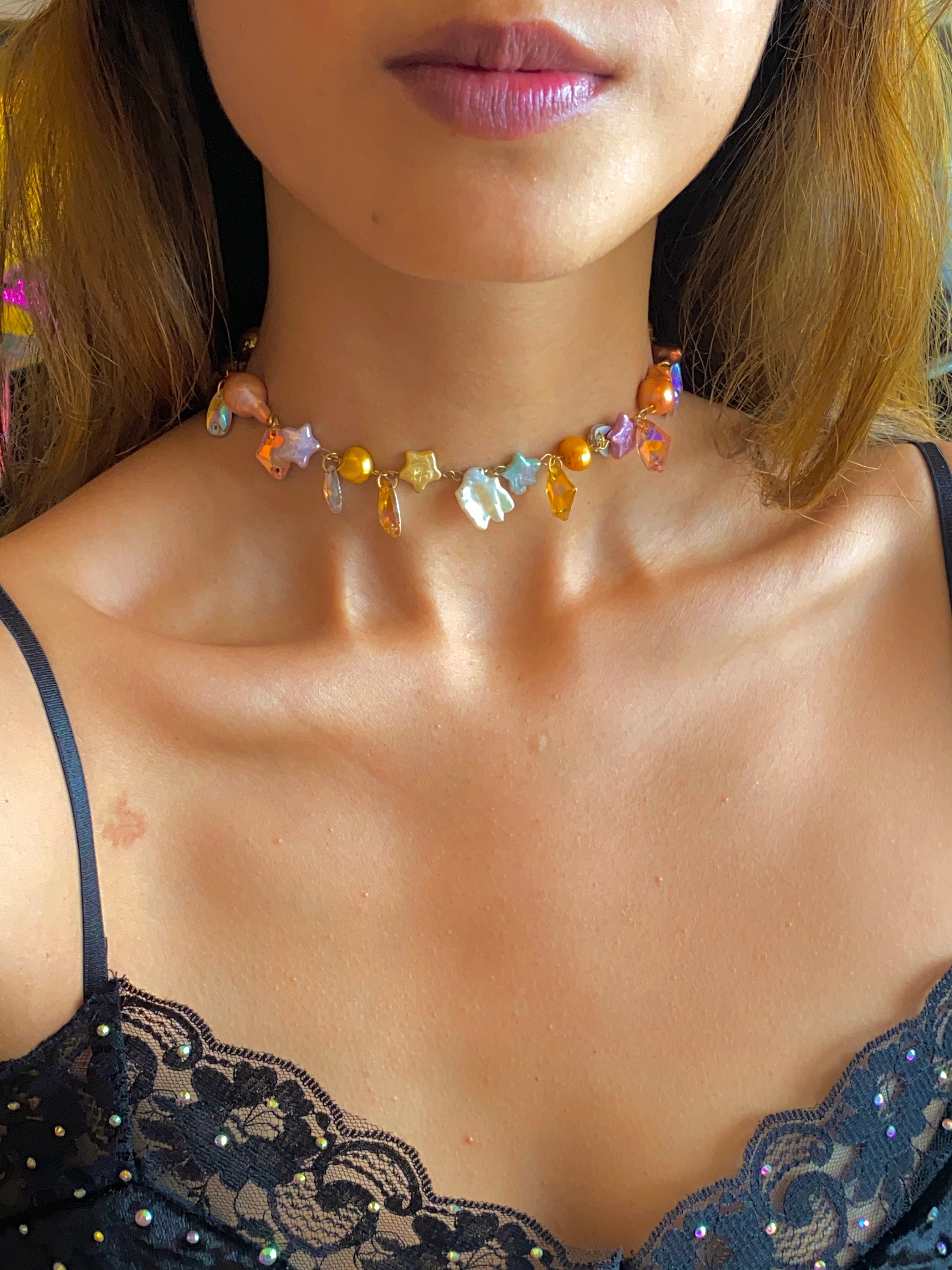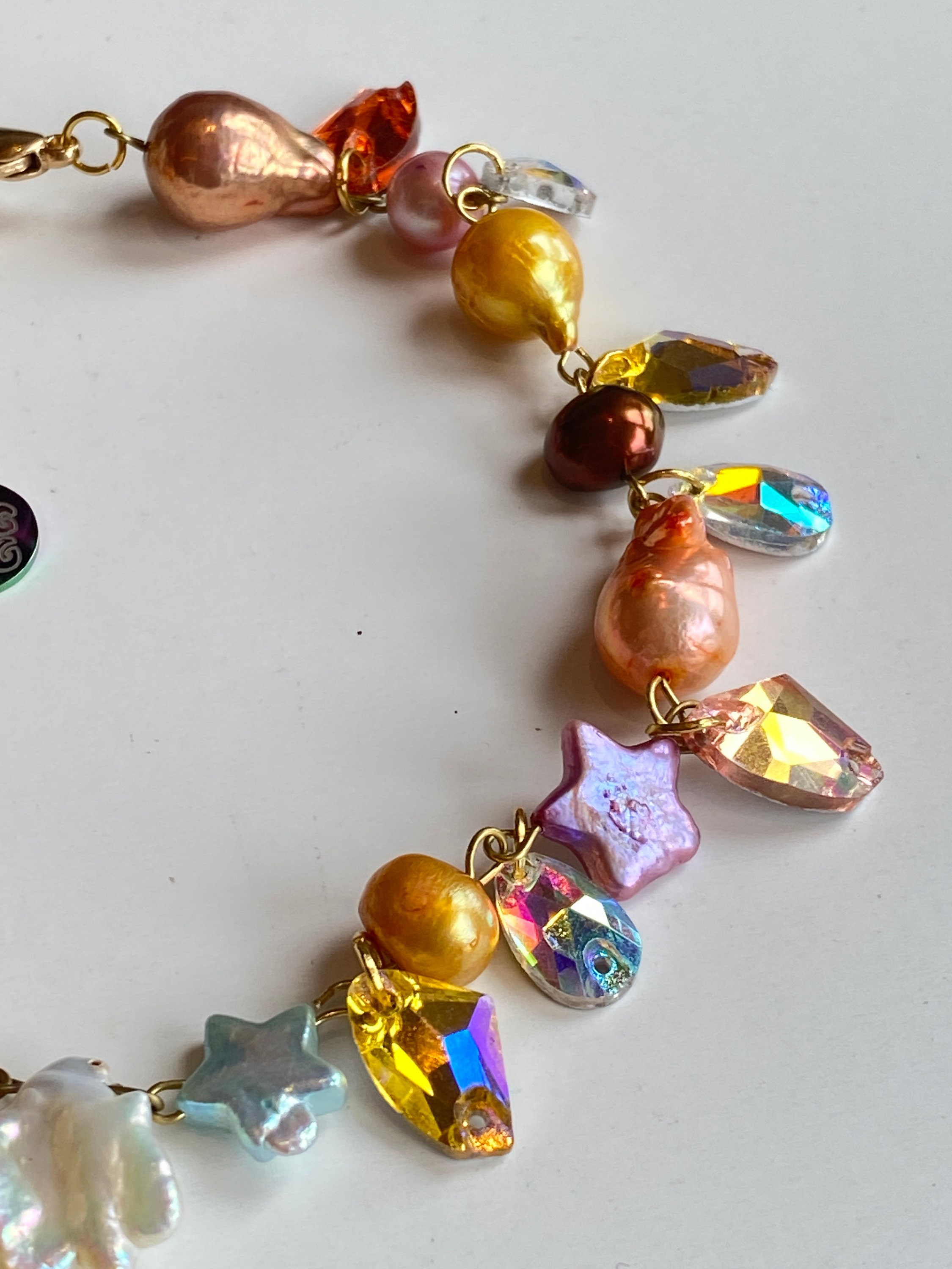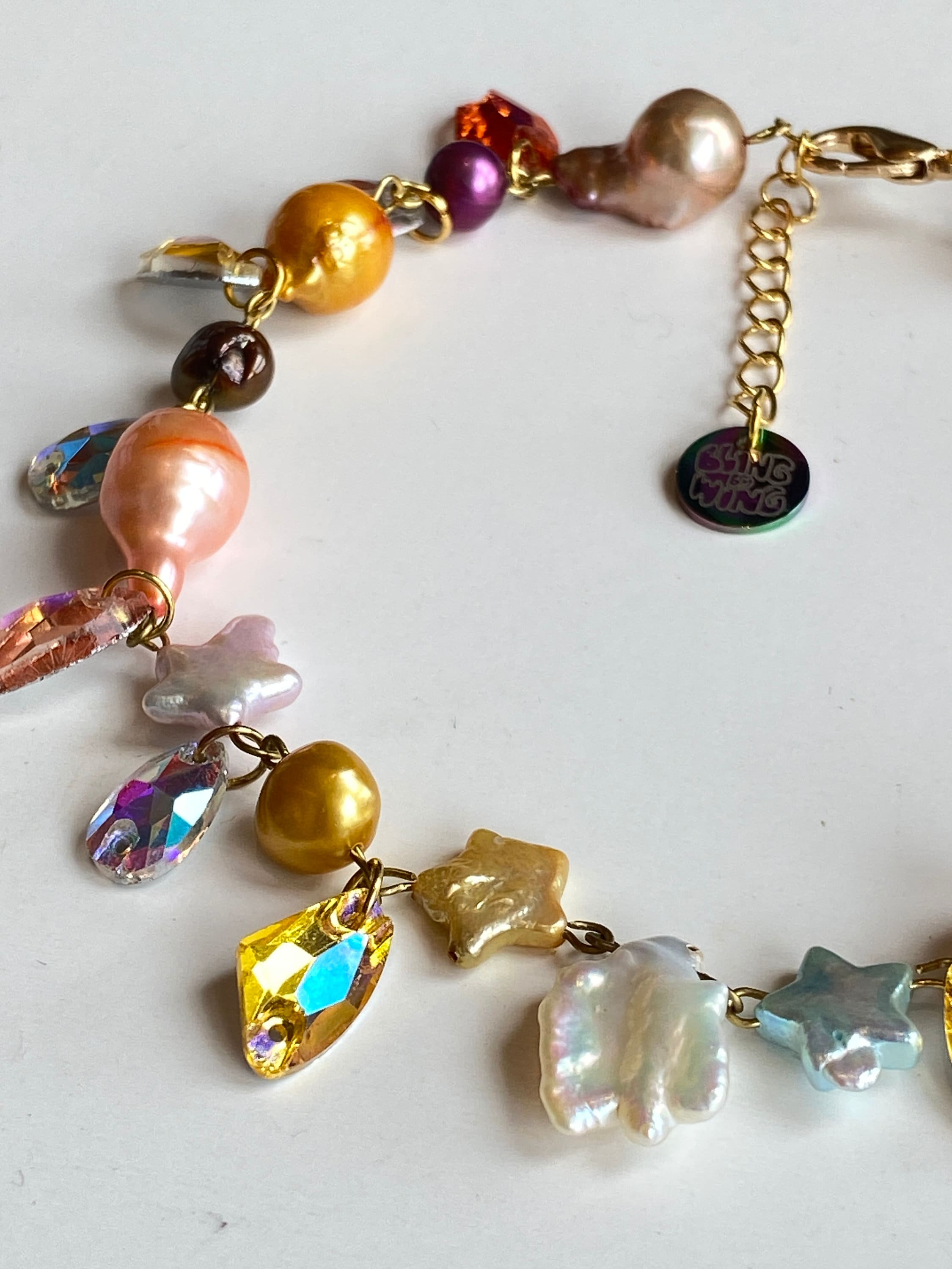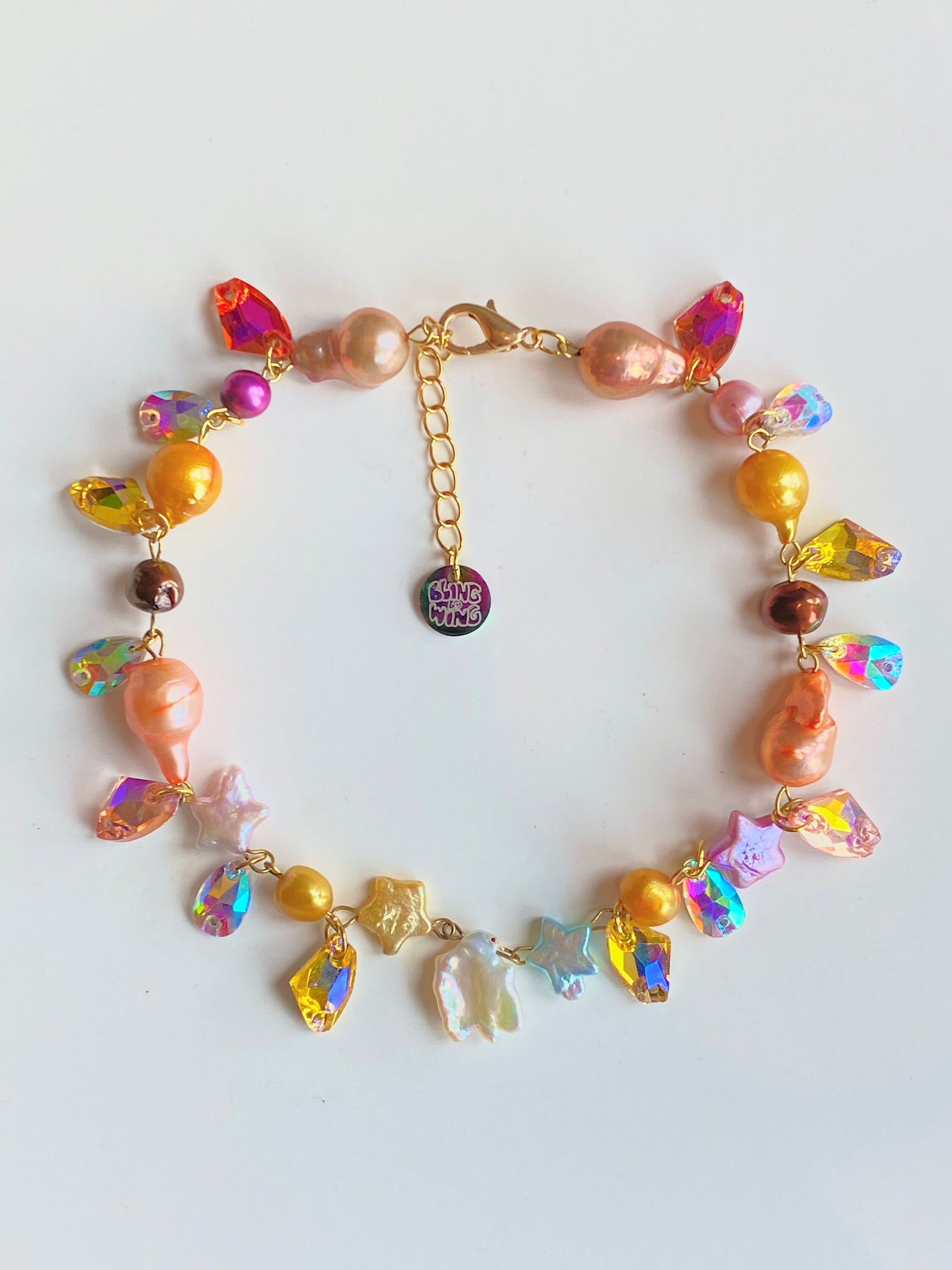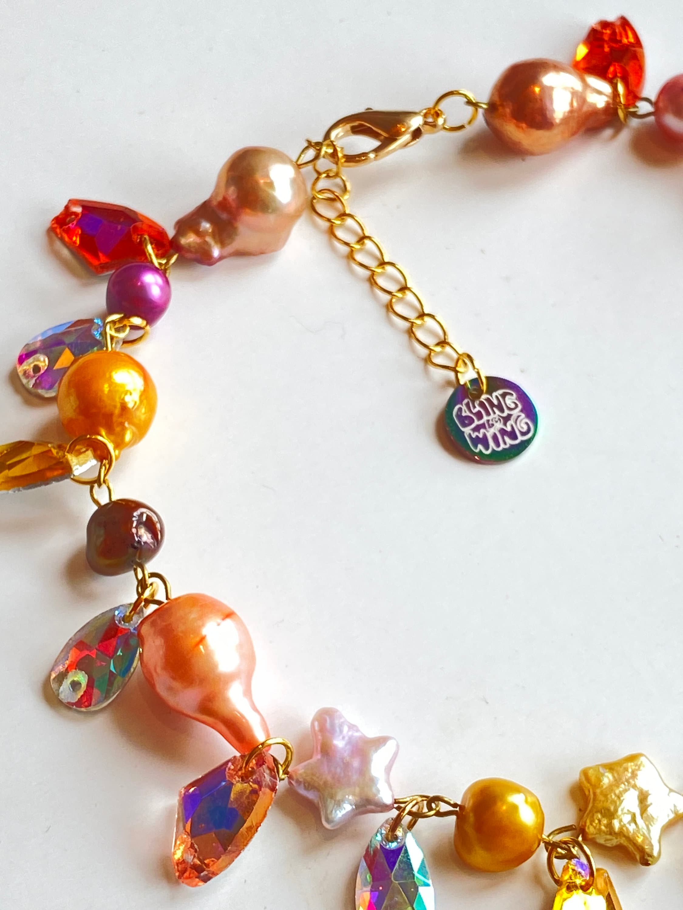 made lovingly with freshwater multicolored baroque pearls, potato pearls, star shaped pearls and faux gemstones. finished with a signature bling by wing charm tag!